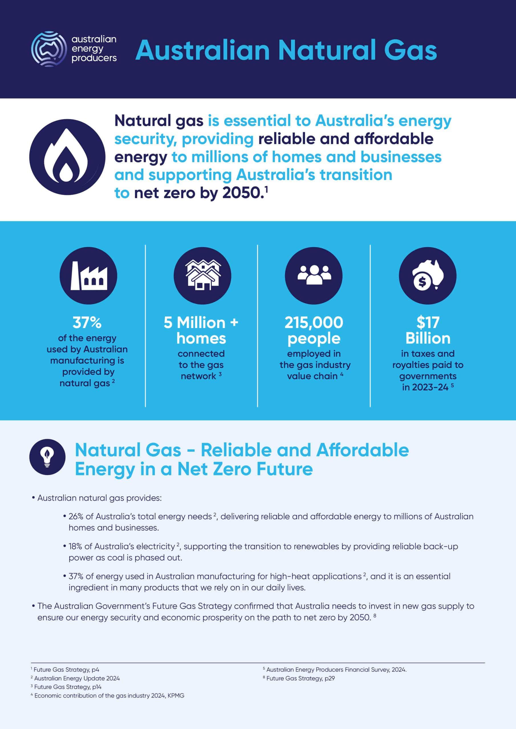 Natural gas is essential to Australia’s energy security, providing reliable and affordable energy to millions of homes and businesses and supporting Australia’s transition to net zero by 2050. Download fact sheet Share: envelope icon Fact Sheets